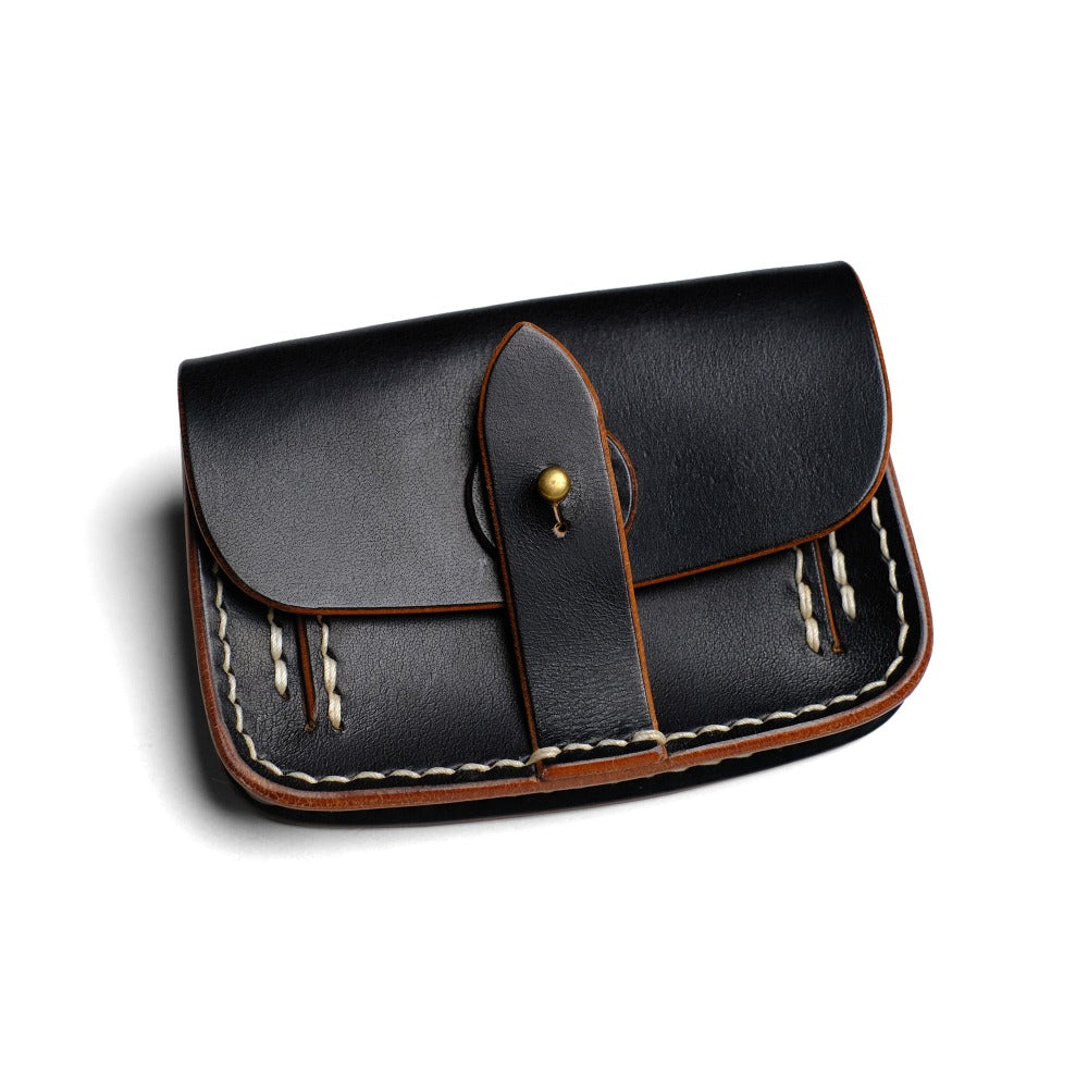 ギボシタイプのコインウォレットです。容量を増やすためサイドにマチを付けました。取り出す際に口が広がるように造作をしていますので、コインの取り出しが容易にできるように工夫されています。中には仕切りもありますので、札も収納可能です。裏面にはポケットが付けており、定期やカードを収納して定期入れとしても仕様できる優れものです。柔らかいラインのデザインが収まりよく飽きの来ない一品です。