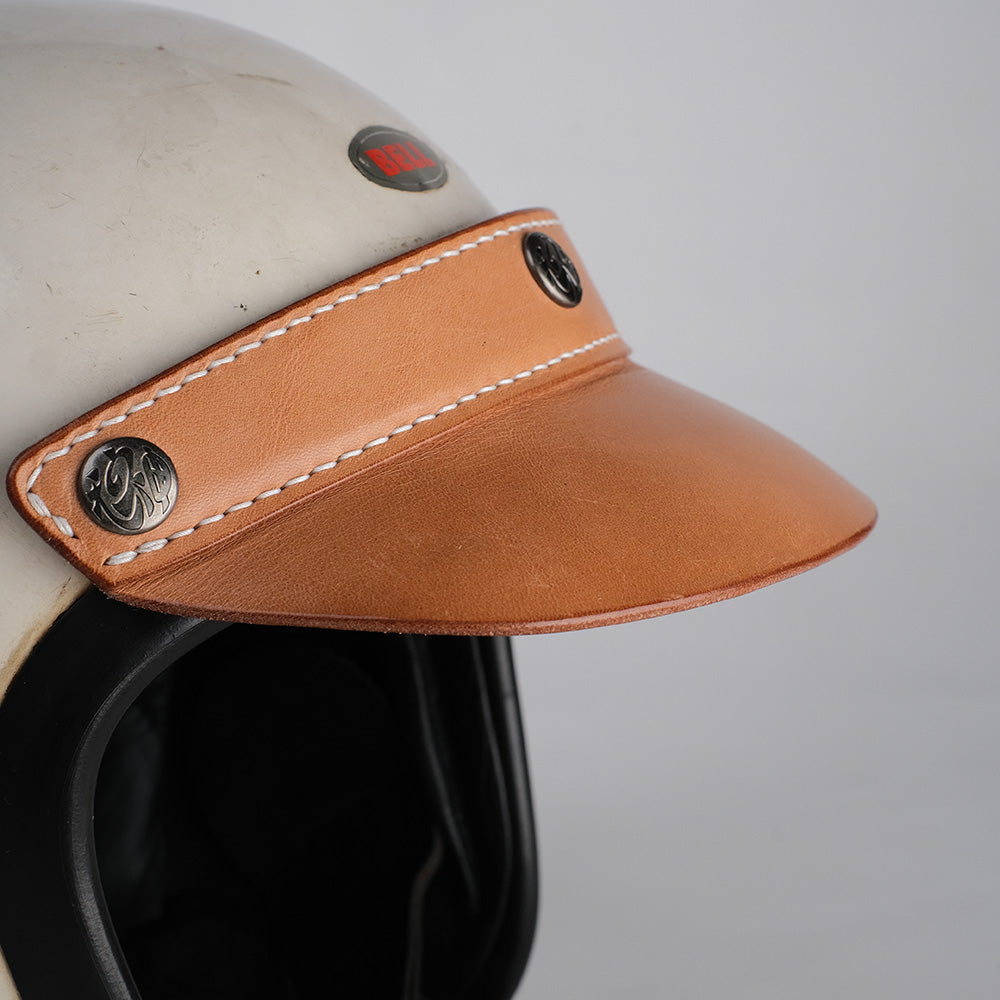 60s-70sのヴィンテージバイザーをデザインソースとして、オールレザーでモディファイしました。 ステッチワークはオールハンドソーイングで、ヴィンテージヘルメットやヴィンテージライクなヘルメットの雰囲気にベストマッチします。 ツバの部位はタンニングレザーの特性を活かし、形を形状記憶させ、一枚革を美しいカーブを描いた形を定着させております。 コバも全て時間をかけて手でしっかりと磨き上げ、耐久性は勿論の事、そのツヤ感がさらにこのバイザーの高級感を高めてくれてます。 スナップは天神ワークスオリジナルのブラス製スナップで、あらゆるヘルメットに汎用で装着できます。 ツバの長さは2種類から選べます。カラーは6色から選べますので、ご愛用のバイクやヘルメットに合わせて、カラーを楽しめます。 バイクライフにおいて走る度に風合いも増すレザバイザー、バイクエイジングと共にどうぞお楽しみ下さい。