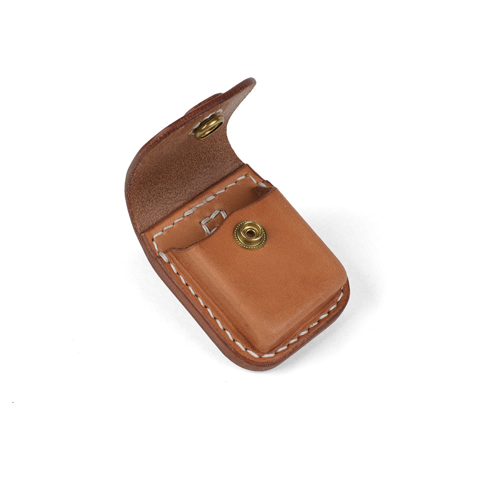 ベルトに装着して腰に吊るすタイプのジッポケースです。ホックは表面を革で巻き金具で周りを傷つけることを防ぎます。シンプルなデザインで飽きがこず、腰周りにさりげないアクセントを持たせてくれます。ジッポを保護する肉厚のレザーはあわせ革で7ミリあり、堅牢性も充分です。