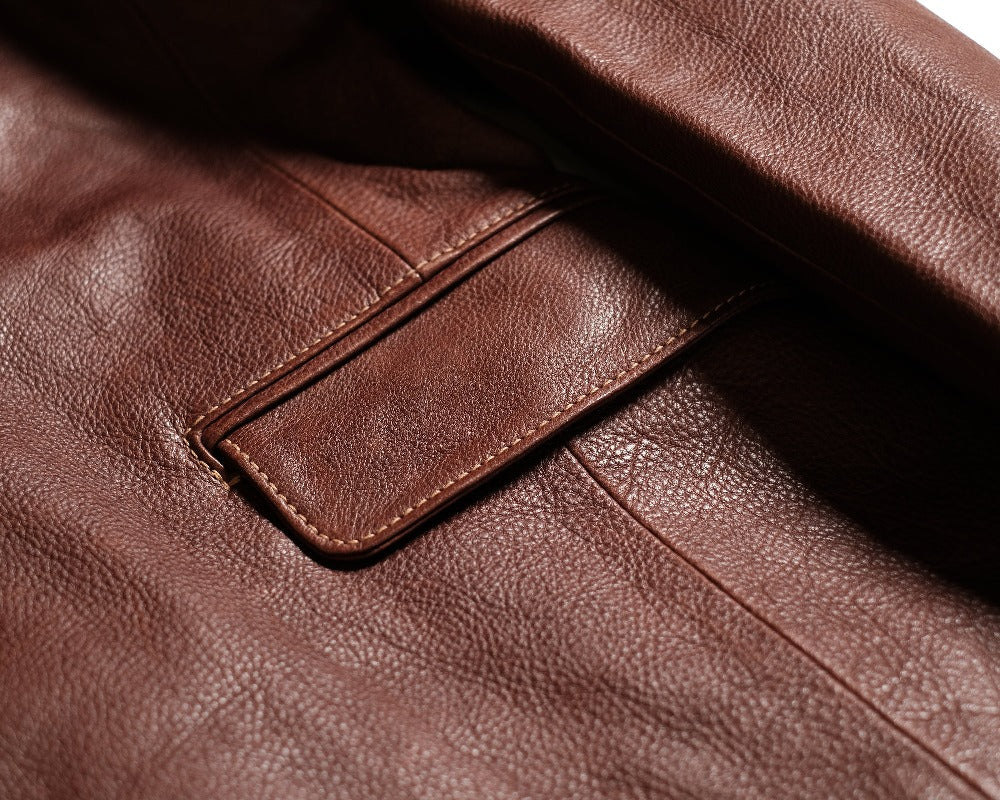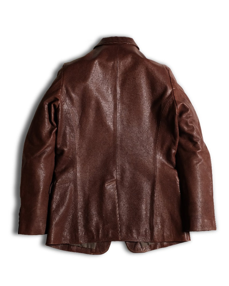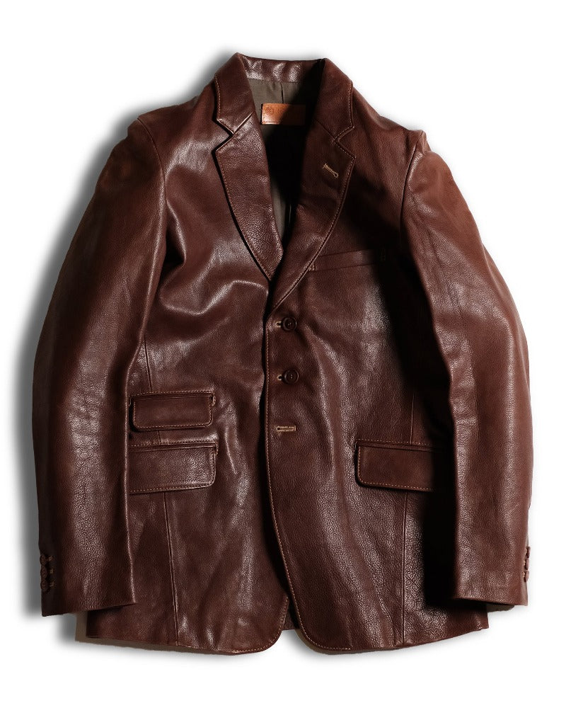 日常のワークで使い古したクラフツマンベストの上にワークアウトにクラフツマンテーラードを羽織る。アフターは行きつけのバーへ。チェンジポケットにはアンティークの懐中時計。程よく馴染んだタンニンなめしの革は大人の余裕を感じさせてくれる。そんなイメージを乗せてクラフツマンの愛したアンティークテーラードをモデシファイしてつくりあげたクラフツマンテーラード。 植物タンニンなめし革にこだわり、その厳選された良質な素材を贅沢に裁断し、1着1着丹念につくりあげたクラフトマンテーラード。クラフツマンベストとの相性も良く2ピースでお楽しみいただけます。革はすべてきめの細かい国産牛(地生)のみを使用しているためその着心地は抜群で充分な腰感を持っています。その1枚革のベンズの部位のみを贅沢に使用したヌメ革はキメ細やかで、着込んでいくごとに身体に吸い付くようになじんでいき、色艶を増し二つと無い至極のオリジナルジャケットに育っていきます。この”育てるジャケット”はラインも日本人の体形に合わせパターンメイキングされ、美しいAラインを描きます。フォーマルシーンは勿論のことカジュアルシーンでも合わせやすく活躍してくれるマストアイテムです。ライニングは軽さと着心地を備えた厳選された素材(コットン、キュプラ混紡)を使用し、袖はビンテージ感漂うストライプ柄を採用。袖、フロントボタンも天然コロゾボタンを使用し、革のみならず天然の風合いで統一感を持たせました。0.9ミリに整えられた革は動きやすくレザーでありながらさらりと羽織ることのできる至極のテーラードジャケットです。カラーバリエーションも豊富です。詳しくはお問合せ下さい。