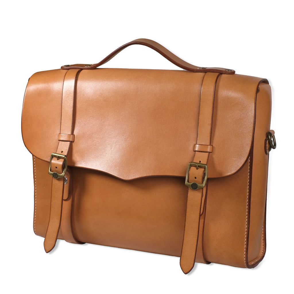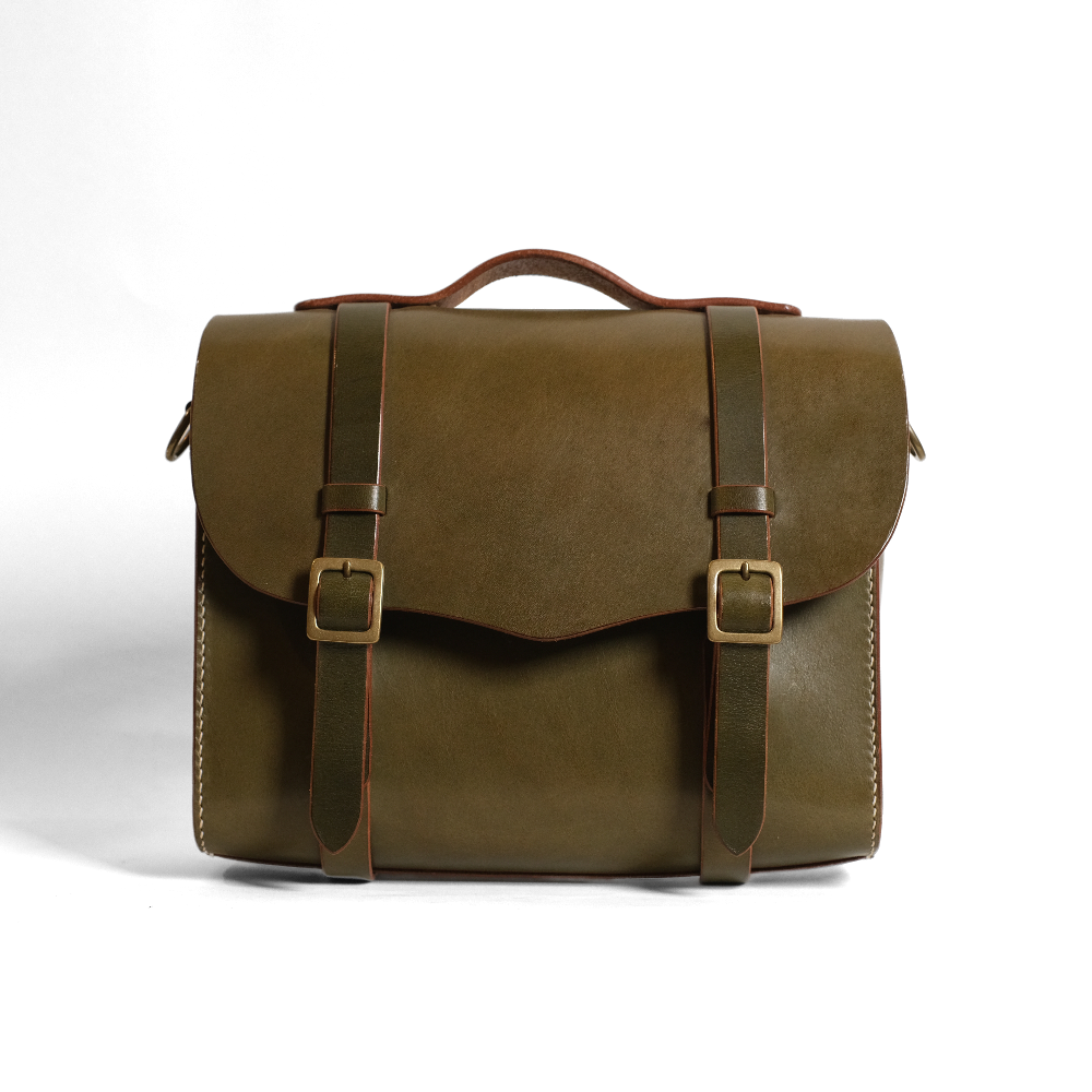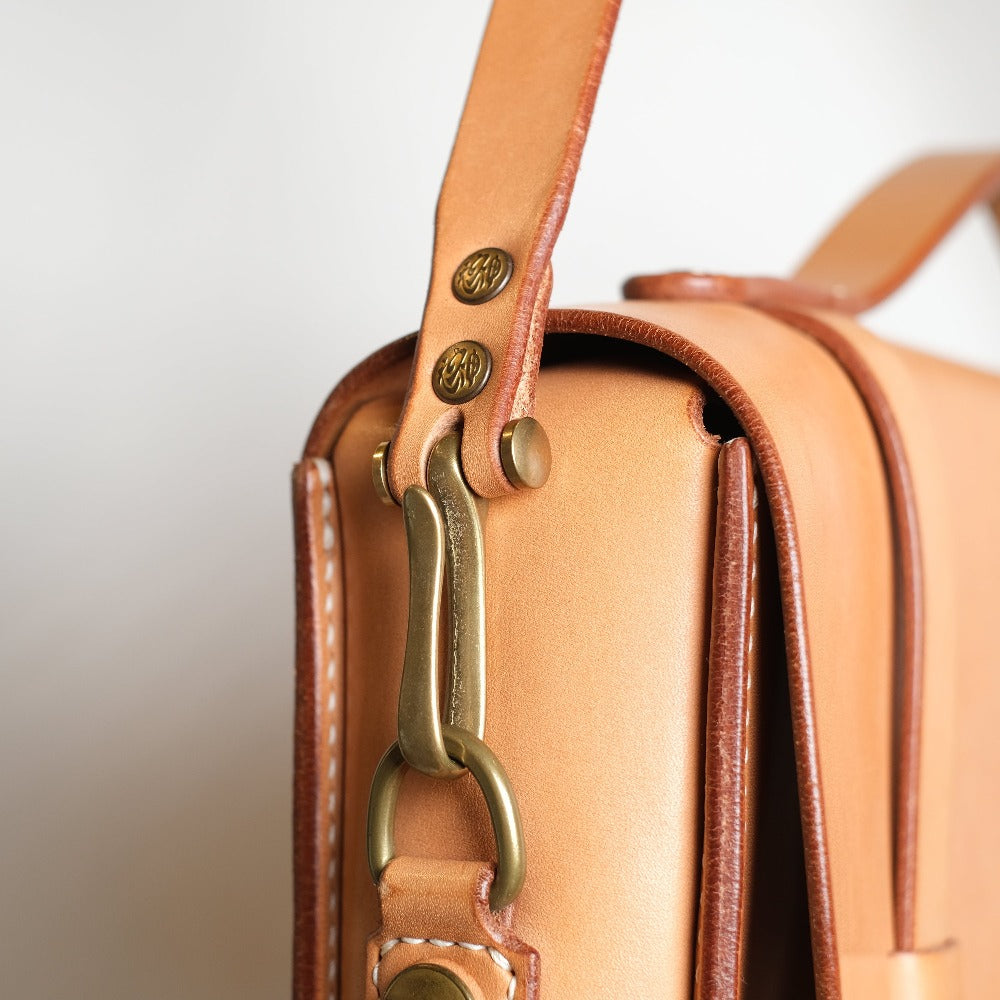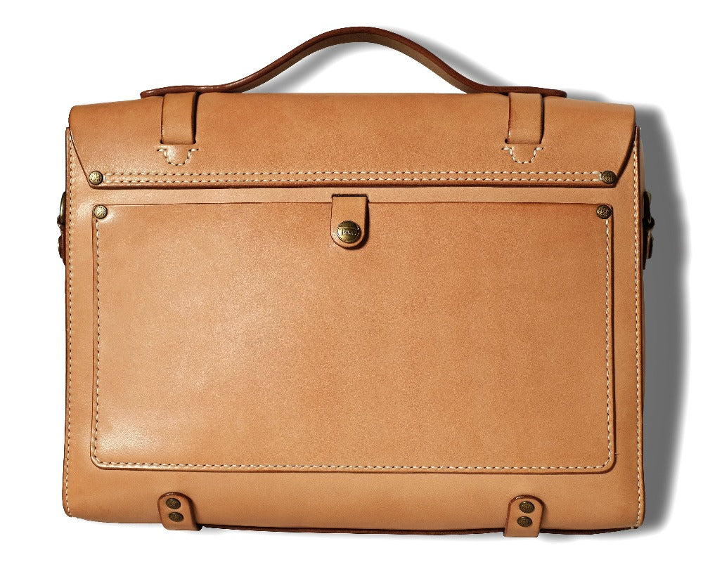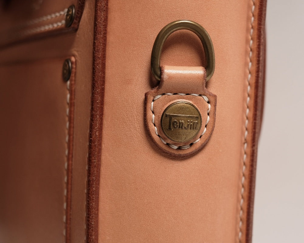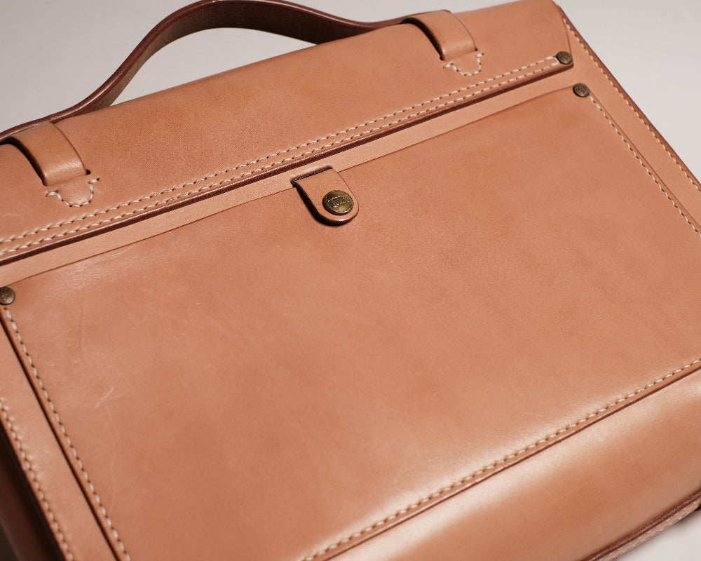 総手縫いでつくられた天神ワークスが誇る”クラフツマンシップ”溢れるブリーフケース。 ハンドルを使っての手持ちは勿論、2wayでショルダーバッグ(ショルダーステラップは別途追加カスタム です)としても使用することができます。 マテリアルも張りとコシ感のあるオリジナルヘビータンニングレザーを贅沢に使用。 その張り出したコバ仕上げの美しさも作品の魅力の一つです。 内装は内ポケット付きで、小物類を仕分けすることができます。 サイズはS、M、Lの3サイズを採用しており、用途に合わせてお選び頂けます。 カッティング、ステッチワークも美しく、フォーマルにもカジュアルにも使える永く愛用していただける バッグです。