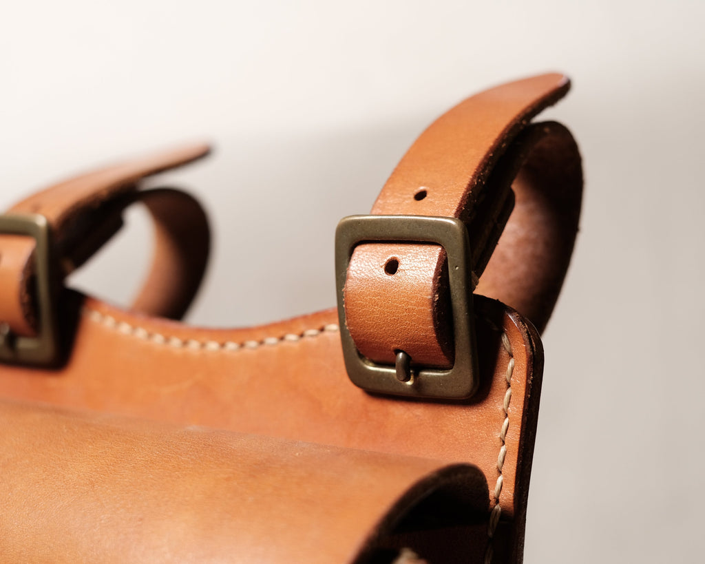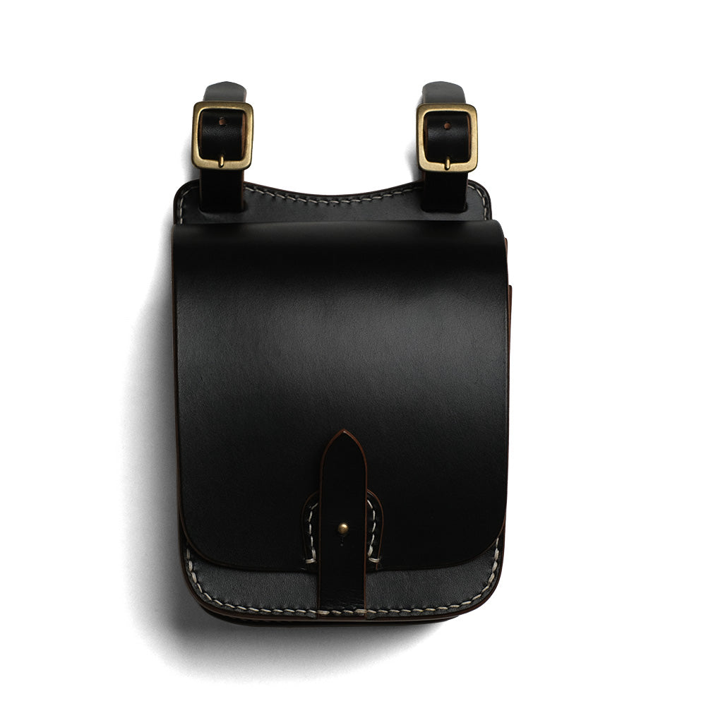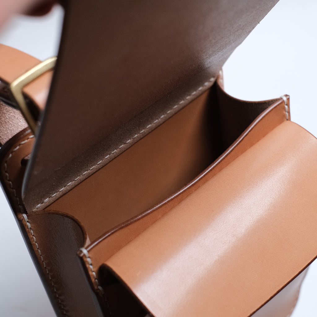 サドルバックを彷彿させるデザインのメディスンバックはシンプルながらも存在感抜群で腰周りを主張します。 真鍮製のギボシの留め具が無骨で逆に新鮮です。真鍮製のバックル付きのベルトループで取り外しできるので、取り付け場所を選びません。中の造作はマチ付のポケットが2ヶ所あり荷物の仕分けが可能です。レザーの経年変化をフルに味わえる質実剛健なアイテムです。