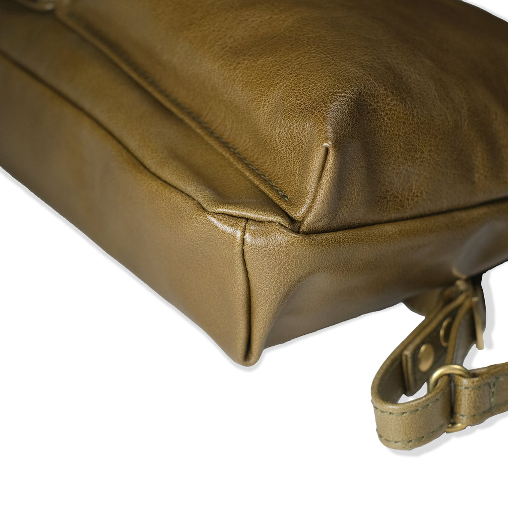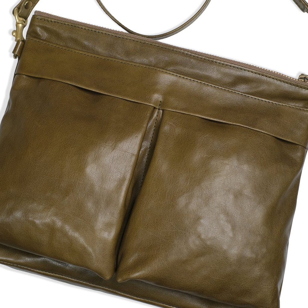 USAFのヘルメットバッグをベースに、普段使いしやすいミニマルなデザインに再構築したバッグです。オリジナルナイロンツイルの光沢感、柔らかさをOiled kip leatherで表現し、さらに高級感のある仕上がりになっています。 メインポケットはタブレットやロングウォレット、ペットボトルを収納でき、象徴的なフロントポケットは大きめのスマートフォンも収納できます。 ヘルメットバッグの無骨さとレザーの高級感は様々なスタイルに合わせやすく、老若男女問わずお使いいただけます。レザーエイジングが進んだ際の形の馴染みもさらにこのバッグの愛着を深めてくれるでしょう。
