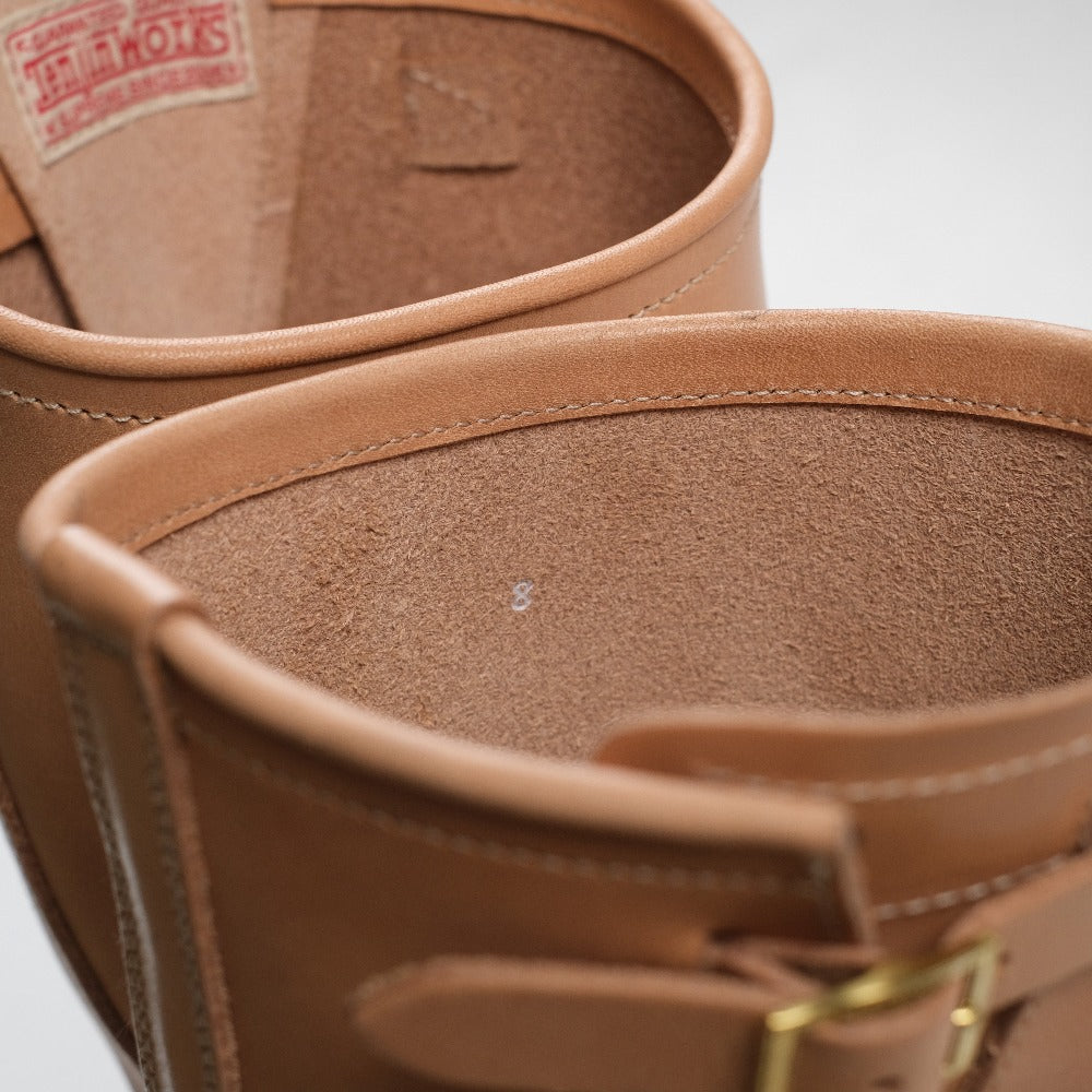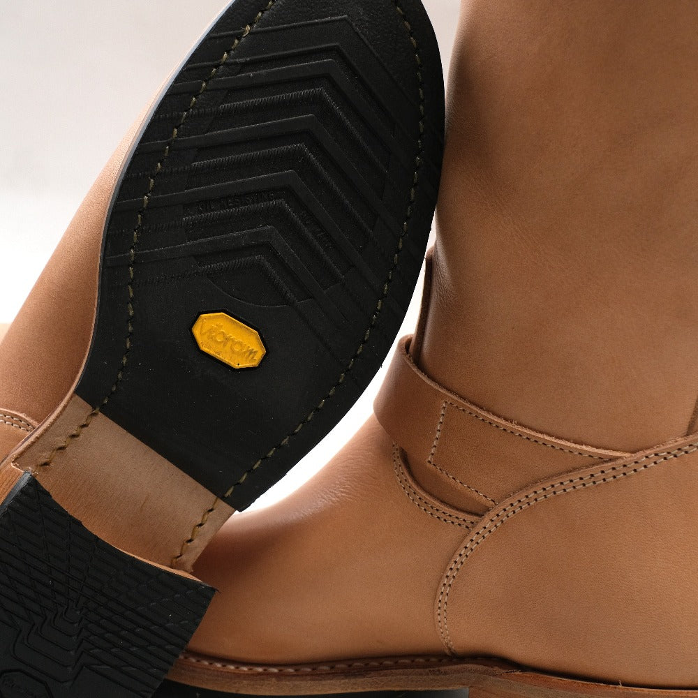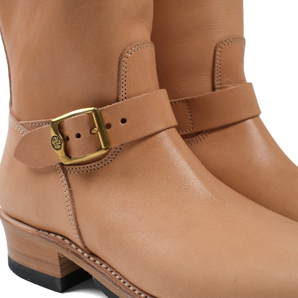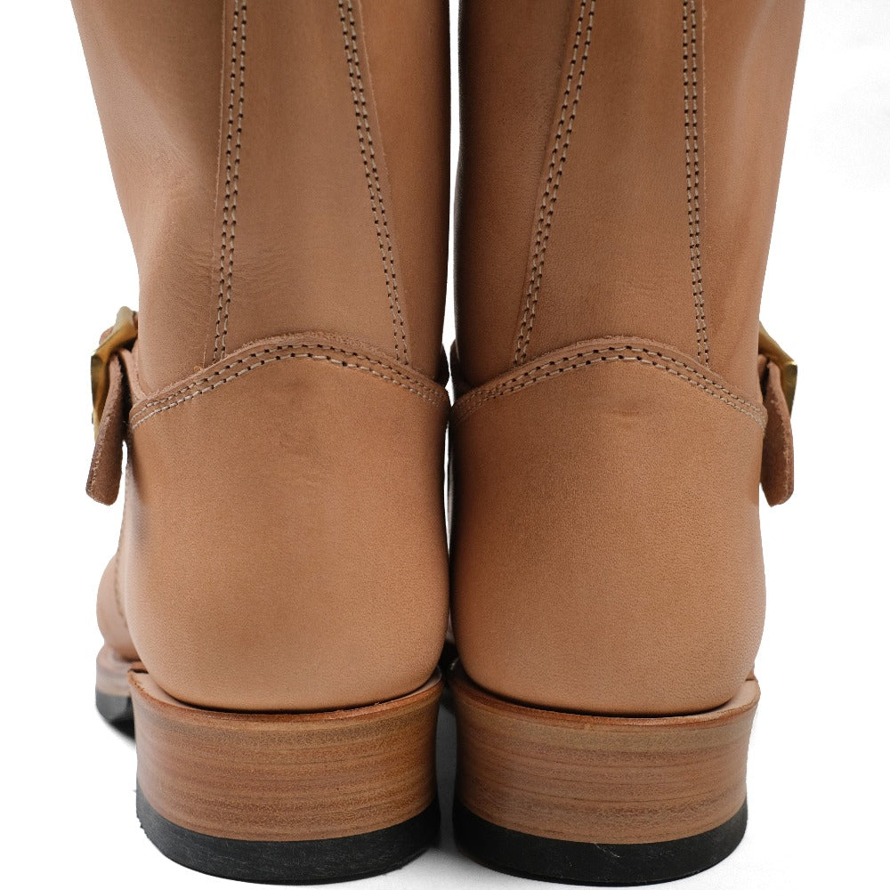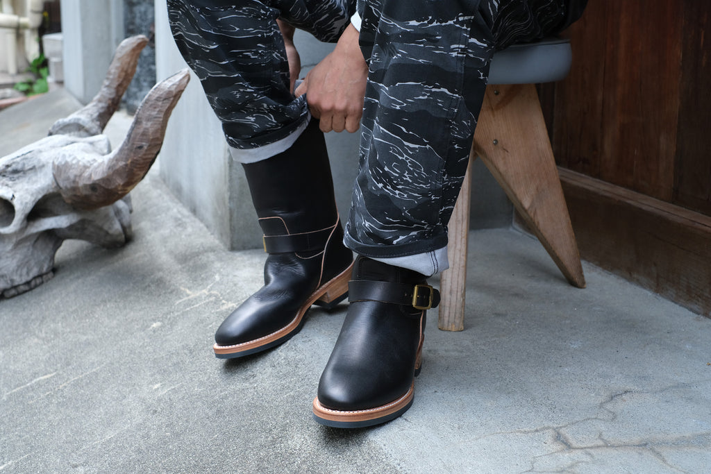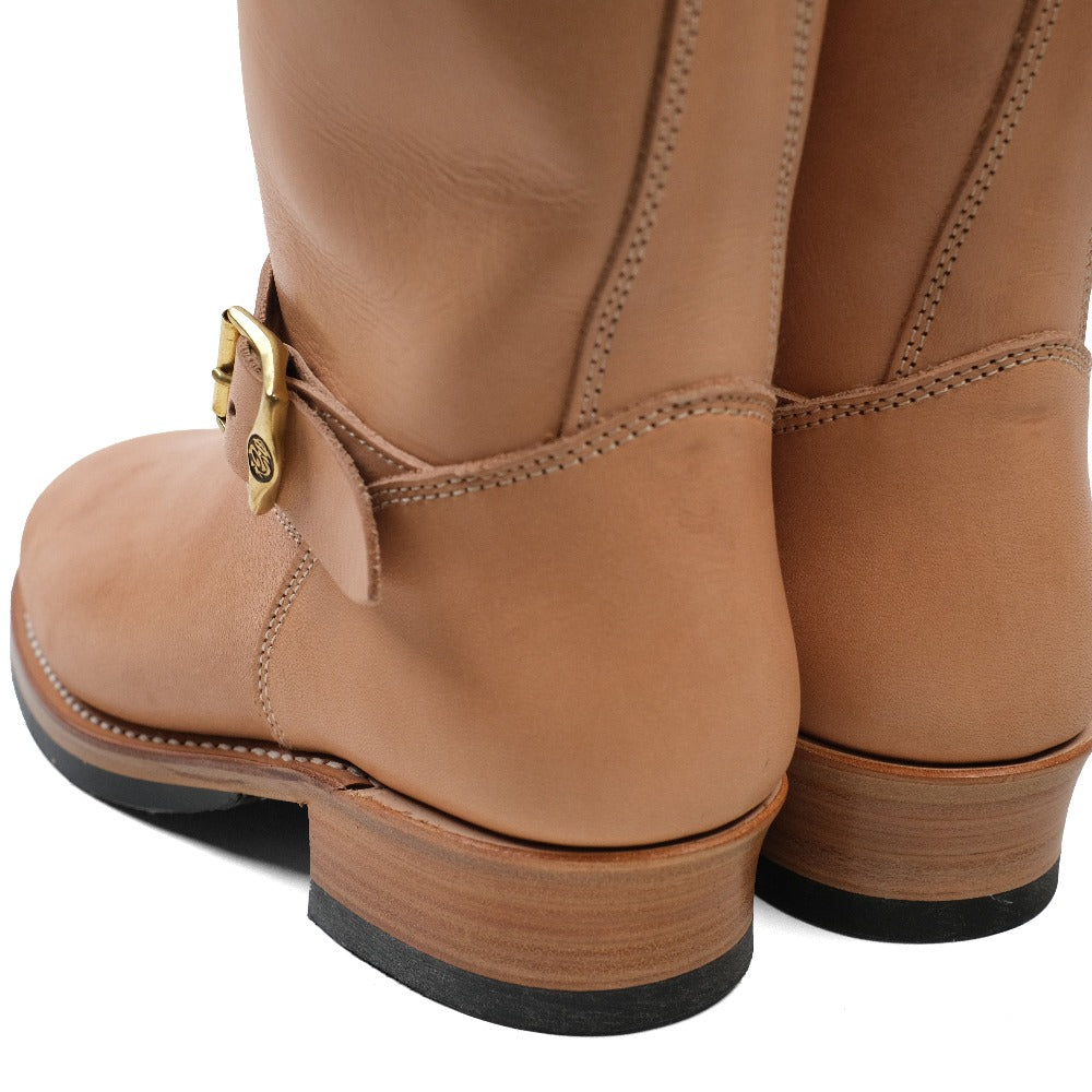 幾度もパターン修正を繰り返し、つくりあげたオリジナルのラストが美しい天神ワークスのスタンダードなエンジニアブーツ。 製法はグッドイヤー製法を採用。 使用する金具もすべてオリジナルのブラス製ピンバックル。 フルベジタブルタンニングレザーのもつ可塑性による経年進化で、使い込んだ後にかたちづくられる造形美とカラーエイジングが楽しみな逸品です。
