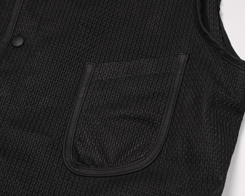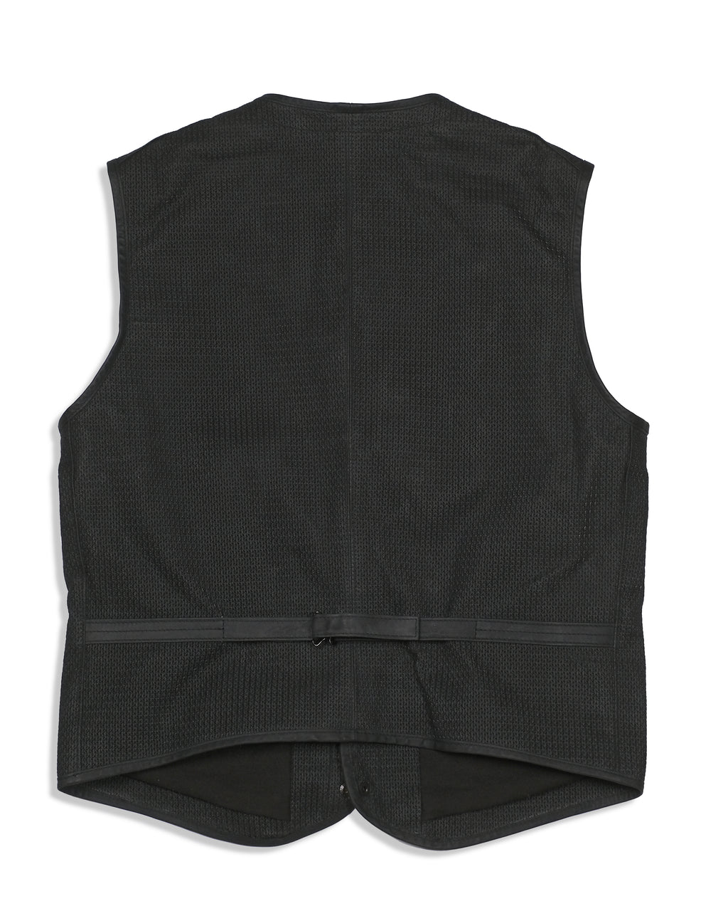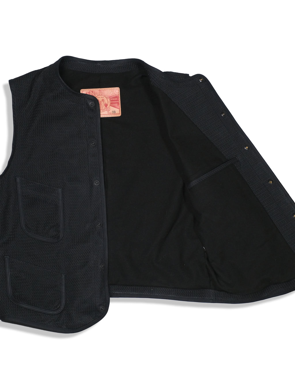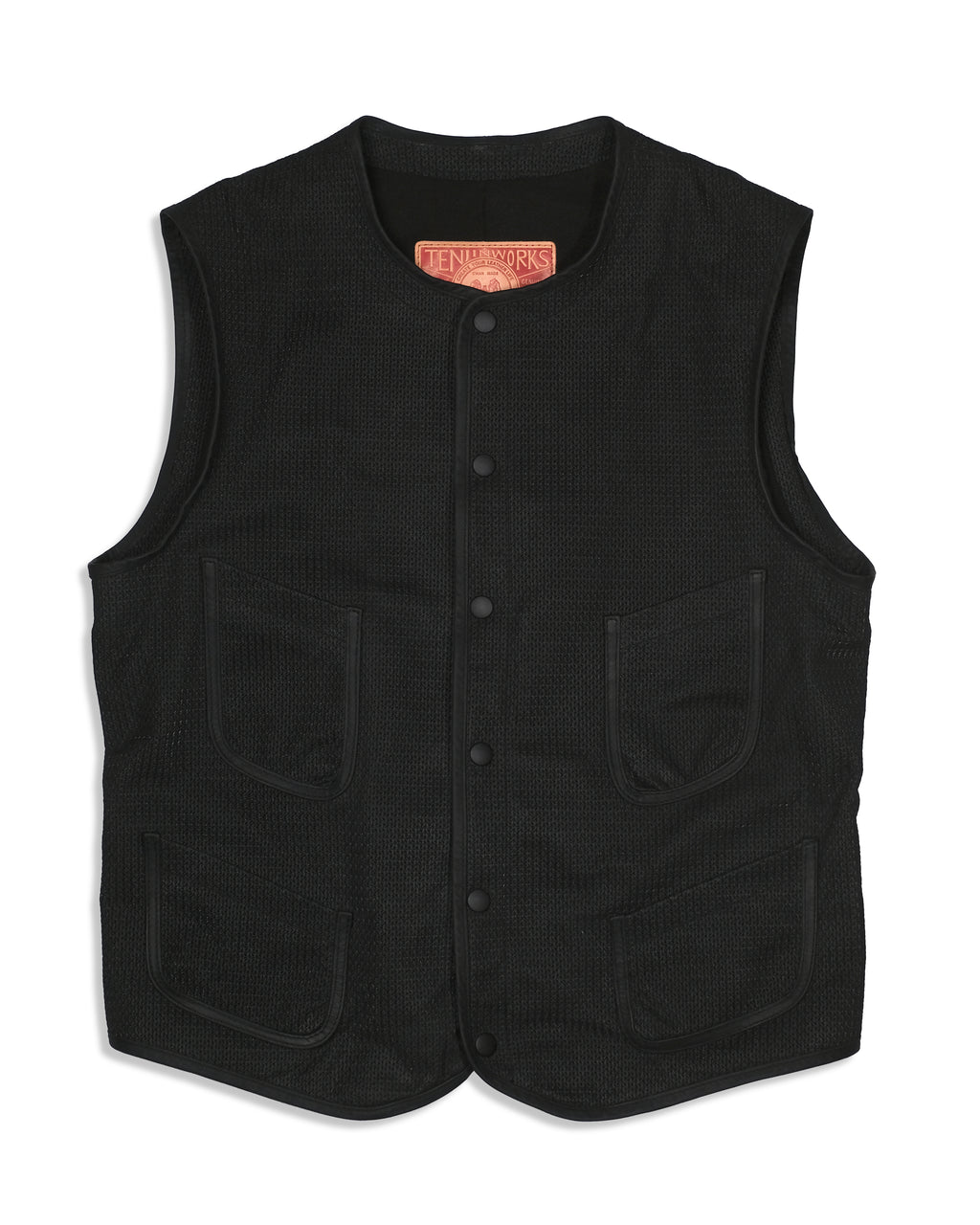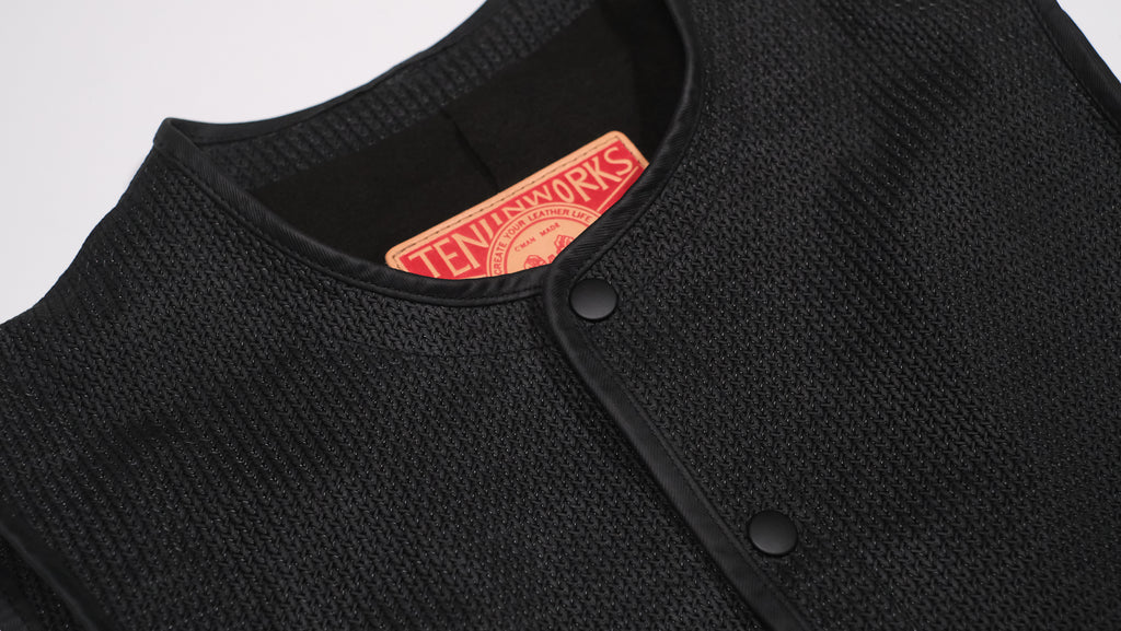 — 1930s Work Style Reimagined — 1930年代のウールワークベストをデザインソースに、 TENJIN WORKSの解釈で再構築したレザーユーティリティベスト。 クラシックな意匠に、現代のマテリアルと縫製技術を掛け合わせることで、 当時には存在しなかった完成度へと昇華させた1着です。 【Material】 ベースとなるのは、ブラッシュ仕上げを施したオリジナルキップレザー。 その表面にウール調のエンボス加工を施すことで、 クラシカルな表情と立体感を演出。 単なる型押しではなく、レザー本来の質感と融合することで 独自の存在感を持つマテリアルに仕上げています。 着用を重ねることでシャープなアタリが現れ、 エンボスの陰影がより際立ち、 唯一無二のエイジングへと育っていきます。 パイピング部分にも綾織りのエンボスを施し、 全体に統一感と高級感をもたらしています。 ライニングにはコットンフランネルを採用。 保温性を確保しながら、柔らかな着心地を実現しています。 【Detail】 ・1930年代に採用されていた「ニップルボタン」を使用 ・ボタンには《TENJIN UTILITY GARMENT》のオリジナル刻印入り ・当時の意匠を再現したシンチバック仕様 ・針刺しバックルを採用(オプションで1930sヴィンテージバックル装着可/別途カスタム費) ・実用的な内ポケット付き クラシックディテールを忠実に再現しながら、 現代的な実用性も備えています。 【Silhouette & Styling】 レイヤードしやすい設計により、 インナーとしても、ライトアウターとしても着用可能。 シャツ、スウェット、ニット、ジャケットの上からでも成立する まさに“Utility”の名に相応しい汎用性を持つ一着です。 ⸻ クラシックを纏い、 時間と共に育てる。 それが、このUtility Vestの本質です。
