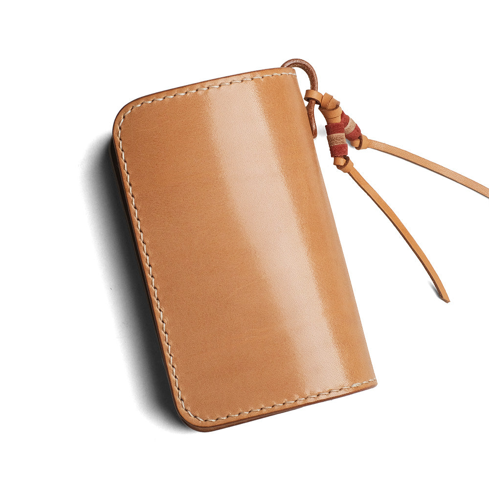 ポケットにも収まりの良いサイズの二つ折りプレーンタイプのウォレットです。 3mm厚の表革を使用しシンプルなデザインですがとても堅牢です。皮革は天神ワークスオリジナルのサドルレザーのベンズのみを使用。再なめしを施した贅沢な皮革はタンニン剤を多く含んでおりますので、腰感が強く、使い込めば深い飴色に変化します。中の造作にも拘り、財布を開くと自然に札入れのポケットが開いてくれる設計。カード入れも独立して5箇所あり、小銭入れには取り出しやすいようにマチがついております。 金具を一切使用していない総手縫い仕上げですので、耐久性も申し分なく育てるレザーの醍醐味をフルに味わえます。 またウォレットロープ等をつなぐ留め革はダブル仕様となり、牛革に鹿ヒモを付けるタイプになります。鹿ヒモもタンニンなめし生成りを使用し耐久性と風合いに拘っています。