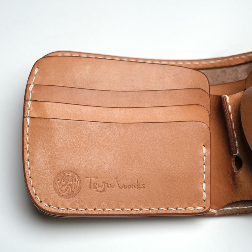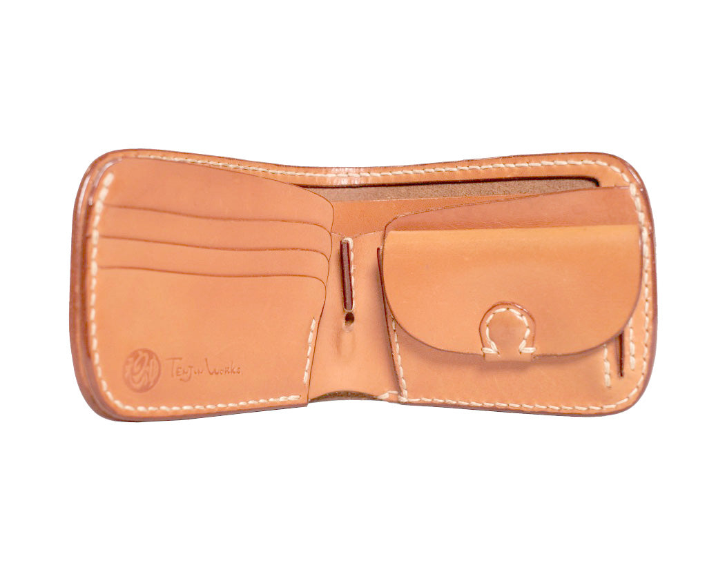 ポケットにすっぽり収まるショートタイプのウォレットです。装飾を排除したシンプルなデザインですが、温かみのある曲線は使い始めから自然と手に馴染みます。中の造作は開いた時に自然と札入れが開く構造となっており、サイドに切り込みを入れておりますので、札の出し入れが容易に出来ます。 カード入れは独立5ヶ所(うち隠しポケット2ヶ所)、小銭入れにはマチを付けて容量を確保しております。 3mm厚の表革は堅牢かるしなやかで洋服を選ばず様々なシーンで活躍してくれるウォレットです。