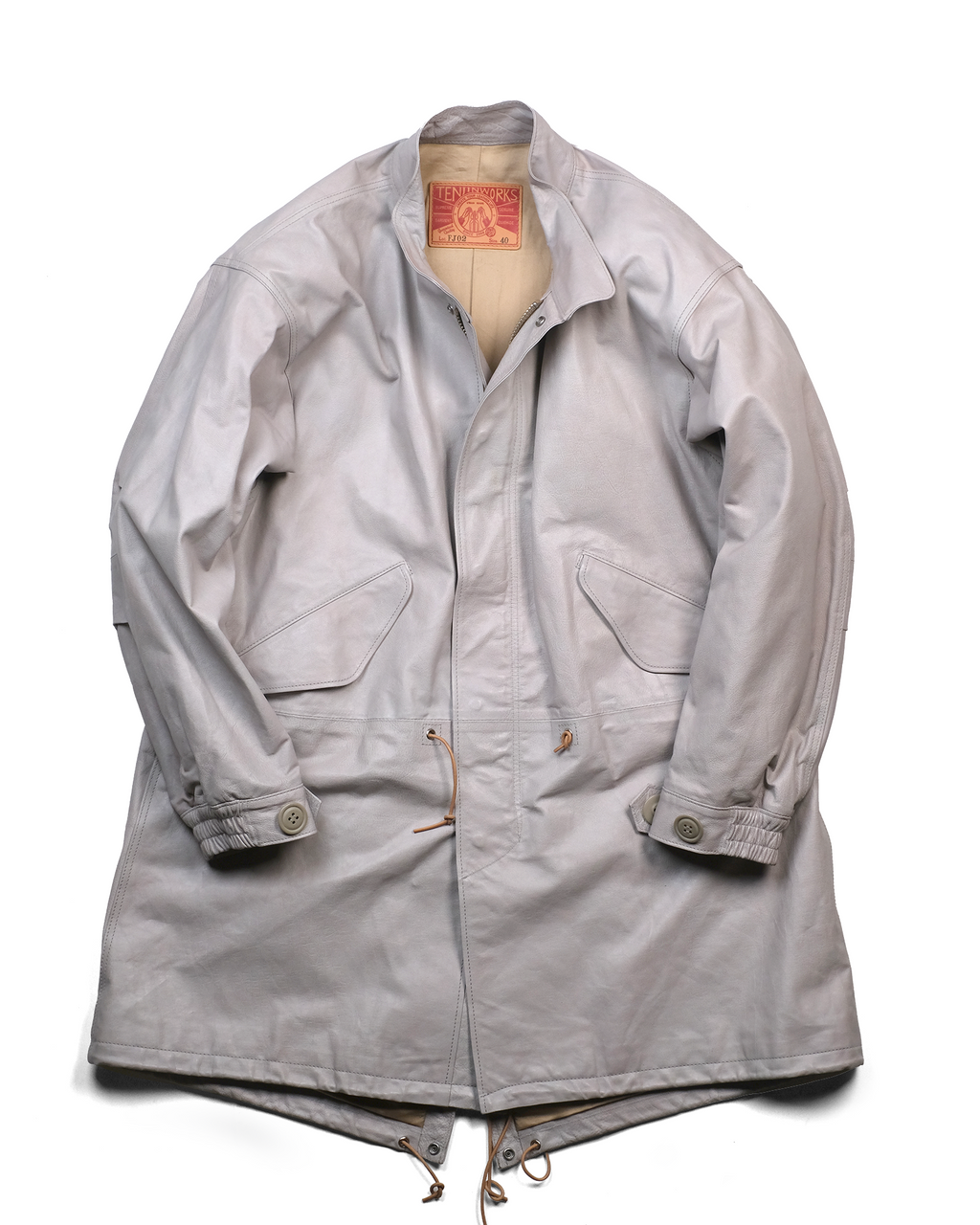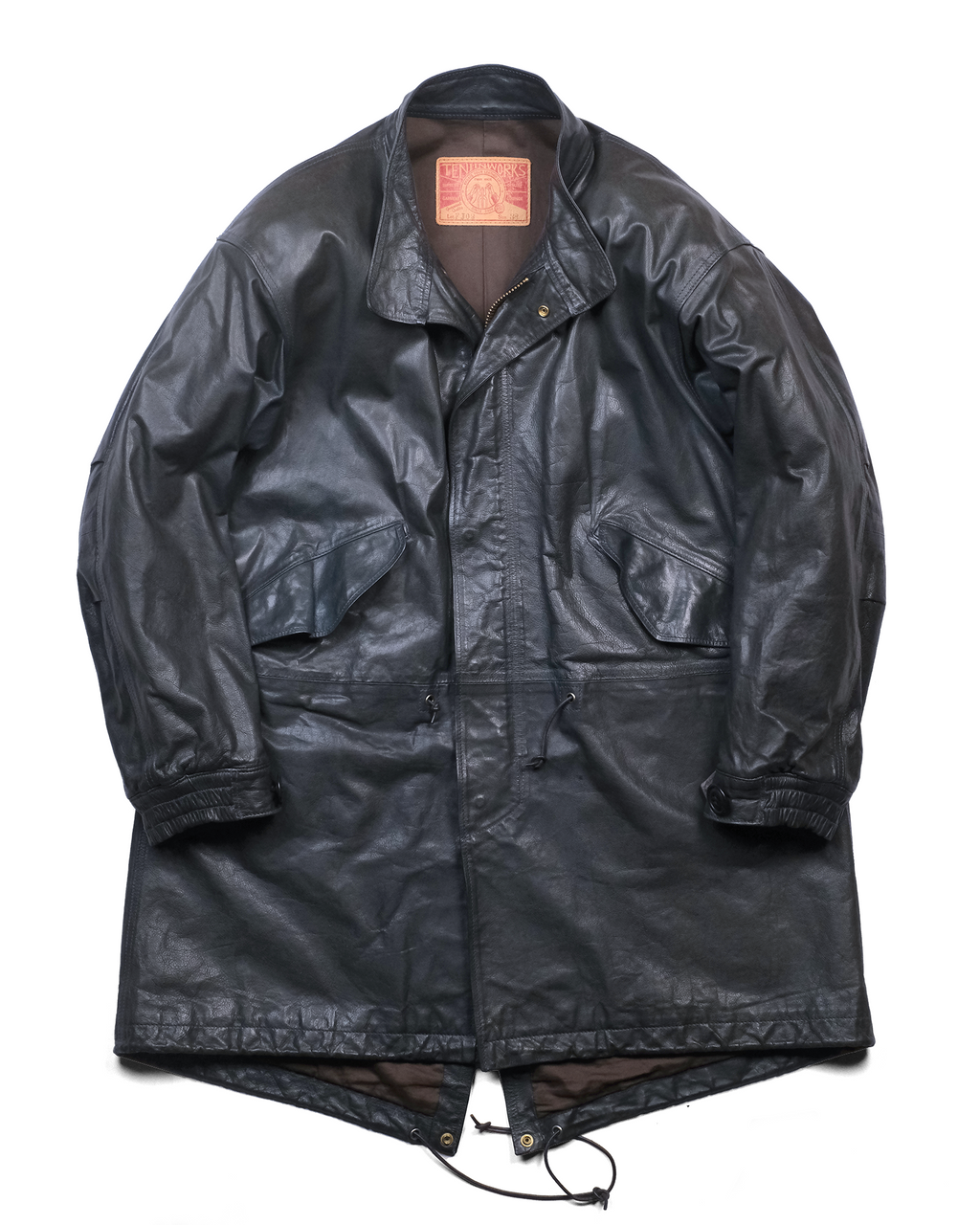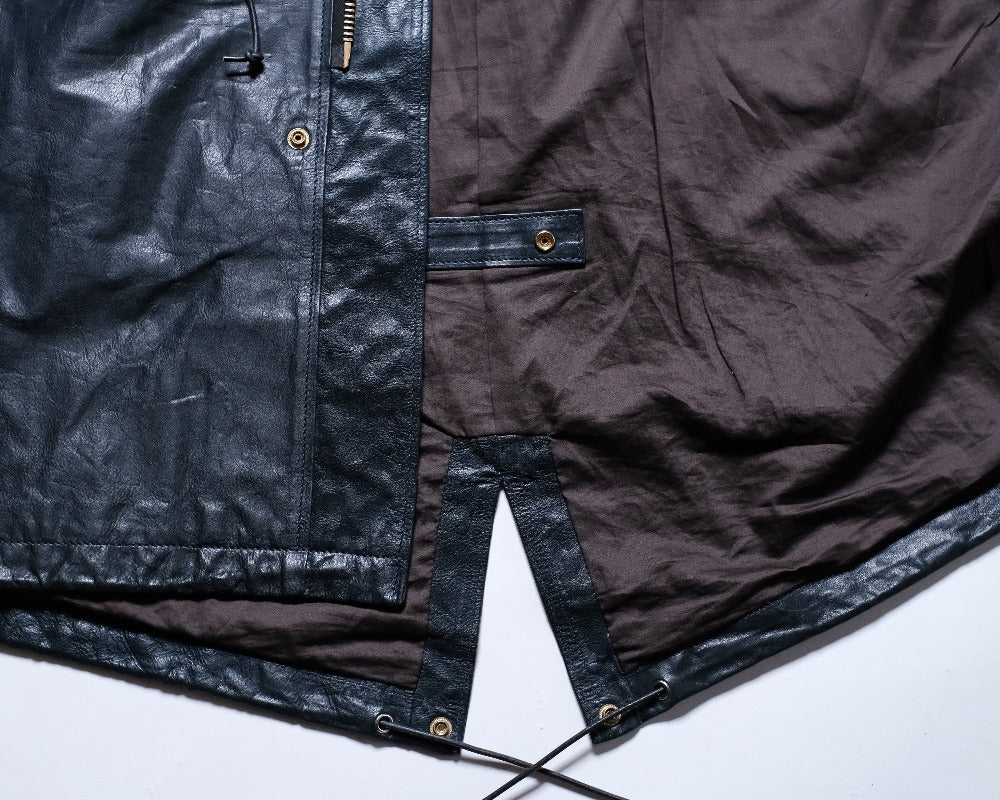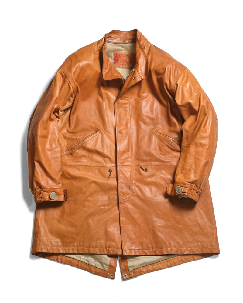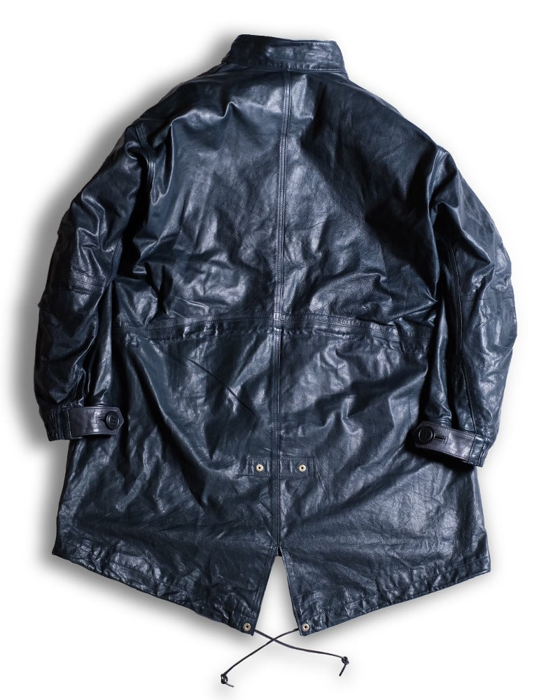 1970s〜のU.S.ARMYのフィッシュテールコートをデザインソースに、キップレザーというきめ細やかなソフトな仔牛の革をシェルに使用し、防寒性に優れた独自のドレープ感を生むレザーコートに再構築させました。。キップレザーは生後6ヶ月〜2年くらいまでの中牛革。キップレザーはキメが細やかなその銀面は美しく、堅牢性も備えた希少な上質なレザーです。この度、そのキップレザーにオイルを加え、ドラムで叩くことでさらに耐久性と堅牢性を増させた"oiled kip leather"を開発しました。オイルドキップレザーを使ったこの新しいカタチのコートは他に類を見ない秀逸なレザーコウェアです。 牛革を使用したクルージャケットのラインが生むそのドレープ感やエイジングは新しいウェアの可能性を広げてくれます。 このジャケットのおけるキップレザーの厚みは理想的な質感を追い求め0.6mmという厚みに辿り着きました。この厚みに漉くことにより、牛革の素材感と耐久性を保ちつつ、コートらしいドレープ感を生み、そのらしさを追求しました。オイルドキップレザーが薄く漉いても耐久性を保てる堅牢性を保つことができるからこそ実現できたレザーコートです。 革の表層の銀面が薄いキップレザーだからこそ実現できた革厚と確かな縫製で他に類をみないコーチジャケットの誕生です。 ライニングのコットンサテンも天然素材で風合いも良く、肌触りは滑らかで擦れにも強度を保たせました。シェルのキップレザーの防風性の強さに相まって、薄く軽いながらも防寒性においても高いパフォーマンスを見せてくれます。 袖先のサイズ調整ボタンもミリタリーの雰囲気を彷彿させるボタンを採用。袖先のゴムリブとステッチワークはそのデザイン性に富み、フィット感と防風性に優れております。各素材とつくりに妥協はございません。 程よい高さのあるスタンドカラーは様々な洋服との相性が良く、そのカタチの変化で楽しむのも良いでしょう。パターンはドロップショルダーのセットインスリーブ。オーバーコートの大きなつくりに加え、各所有機的なカッティングラインを合わせることにより、着用した際のフィッテングと動きやすさ、そしてそのパターンが産み出すラインの美しさは手にした所有者を虜とするでしょう。 天神ワークスが生み出したニュープロデュースの意欲作。多くのシュチュエーションで活躍してくれ、防寒性も高く様々なシーンで活躍してくれるユーティリティーなレザーコートです。