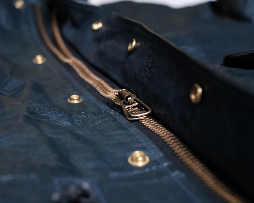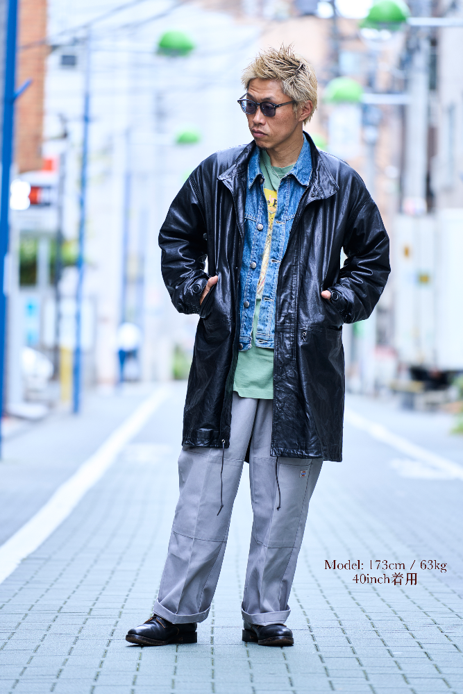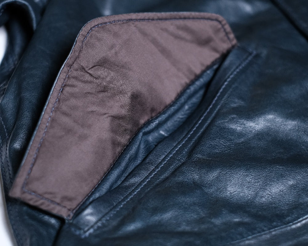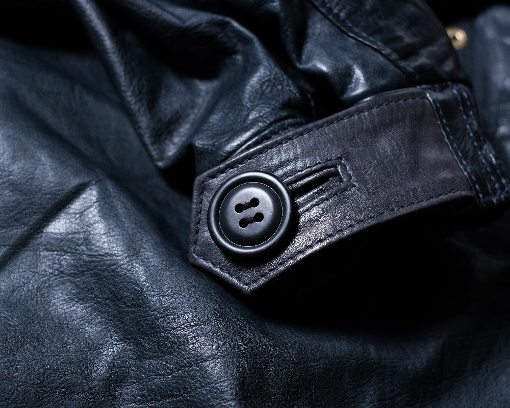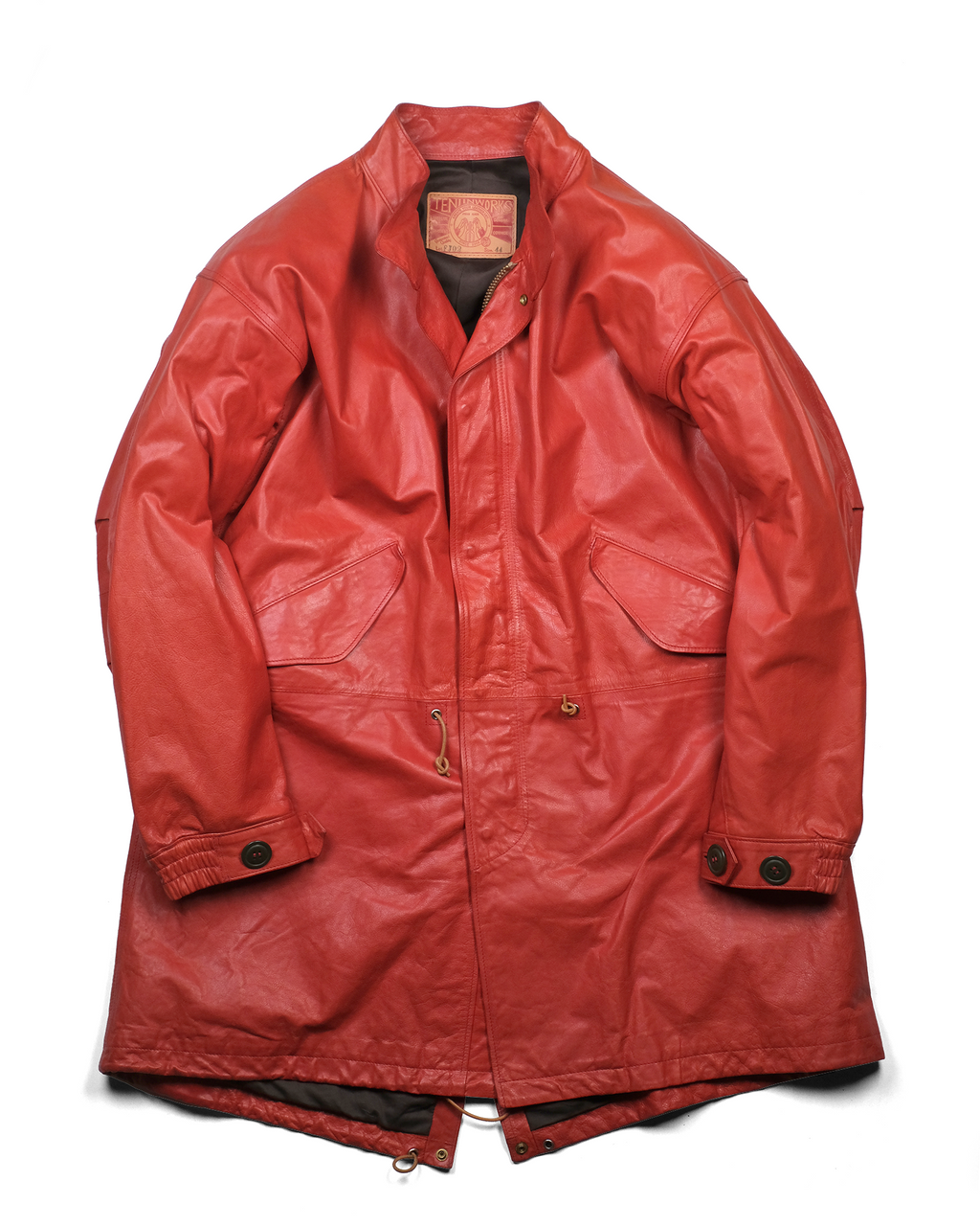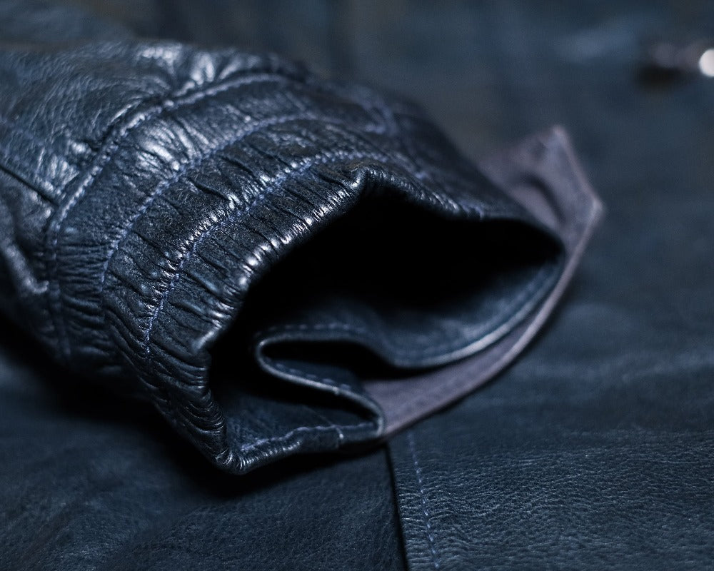 1970s〜のU.S.ARMYのフィッシュテールコートをデザインソースに、キップレザーというきめ細やかなソフトな仔牛の革をシェルに使用し、防寒性に優れた独自のドレープ感を生むレザーコートに再構築させました。。キップレザーは生後6ヶ月〜2年くらいまでの中牛革。キップレザーはキメが細やかなその銀面は美しく、堅牢性も備えた希少な上質なレザーです。この度、そのキップレザーにオイルを加え、ドラムで叩くことでさらに耐久性と堅牢性を増させた"oiled kip leather"を開発しました。オイルドキップレザーを使ったこの新しいカタチのコートは他に類を見ない秀逸なレザーコウェアです。 牛革を使用したクルージャケットのラインが生むそのドレープ感やエイジングは新しいウェアの可能性を広げてくれます。 このジャケットのおけるキップレザーの厚みは理想的な質感を追い求め0.6mmという厚みに辿り着きました。この厚みに漉くことにより、牛革の素材感と耐久性を保ちつつ、コートらしいドレープ感を生み、そのらしさを追求しました。オイルドキップレザーが薄く漉いても耐久性を保てる堅牢性を保つことができるからこそ実現できたレザーコートです。 革の表層の銀面が薄いキップレザーだからこそ実現できた革厚と確かな縫製で他に類をみないコーチジャケットの誕生です。 ライニングのコットンサテンも天然素材で風合いも良く、肌触りは滑らかで擦れにも強度を保たせました。シェルのキップレザーの防風性の強さに相まって、薄く軽いながらも防寒性においても高いパフォーマンスを見せてくれます。 袖先のサイズ調整ボタンもミリタリーの雰囲気を彷彿させるボタンを採用。袖先のゴムリブとステッチワークはそのデザイン性に富み、フィット感と防風性に優れております。各素材とつくりに妥協はございません。 程よい高さのあるスタンドカラーは様々な洋服との相性が良く、そのカタチの変化で楽しむのも良いでしょう。パターンはドロップショルダーのセットインスリーブ。オーバーコートの大きなつくりに加え、各所有機的なカッティングラインを合わせることにより、着用した際のフィッテングと動きやすさ、そしてそのパターンが産み出すラインの美しさは手にした所有者を虜とするでしょう。 天神ワークスが生み出したニュープロデュースの意欲作。多くのシュチュエーションで活躍してくれ、防寒性も高く様々なシーンで活躍してくれるユーティリティーなレザーコートです。
