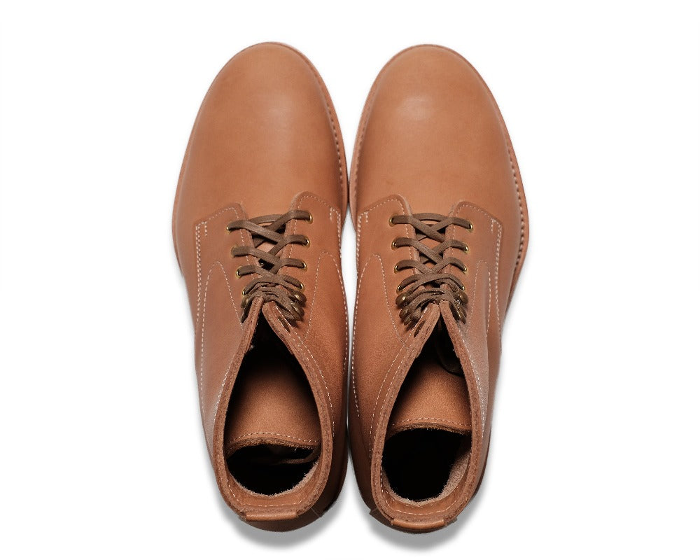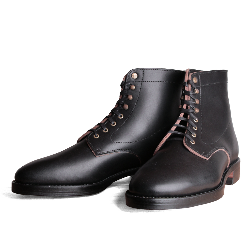 1950年代〜60年代のアメリカ高度成長期を支えた様々な職種のワーカーたちが好んで履いたであろう堅牢でベーシックなデザインのレザーワークブーツをイメージしてカタチにしました。 ブランドの顔である堅牢かつ艶やかなヘビーベジタブルタンニングレザーを2ミリ厚で使用し、履き込んでこそその魅力が増します。永年使い込んだ様はまるで現代に蘇ったヴィンテージのような表情を見せてくれることでしょう。 ラストは天神ワークスオリジナルで1から製作しました。幾度となる修正を加えて、日本人の足型に合うスタイリッシュで飽きのこないナローな美しいラインが描けるようにつくりあげました。 製法はグッドイヤーウェルト製法を採用。ソール替えも容易で耐久性も高い信頼の置ける製法です。 7ホールのハイトも使いやすく様々なスタイルに合わせることができます。 カラーはタンカラーとブラックの2色展開。カラーによって見せる顔が違ってきます。 ソールもレザーソールを採用し、素材も贅の限りを尽くした飽きの来ないスタンダードワークブーツです。