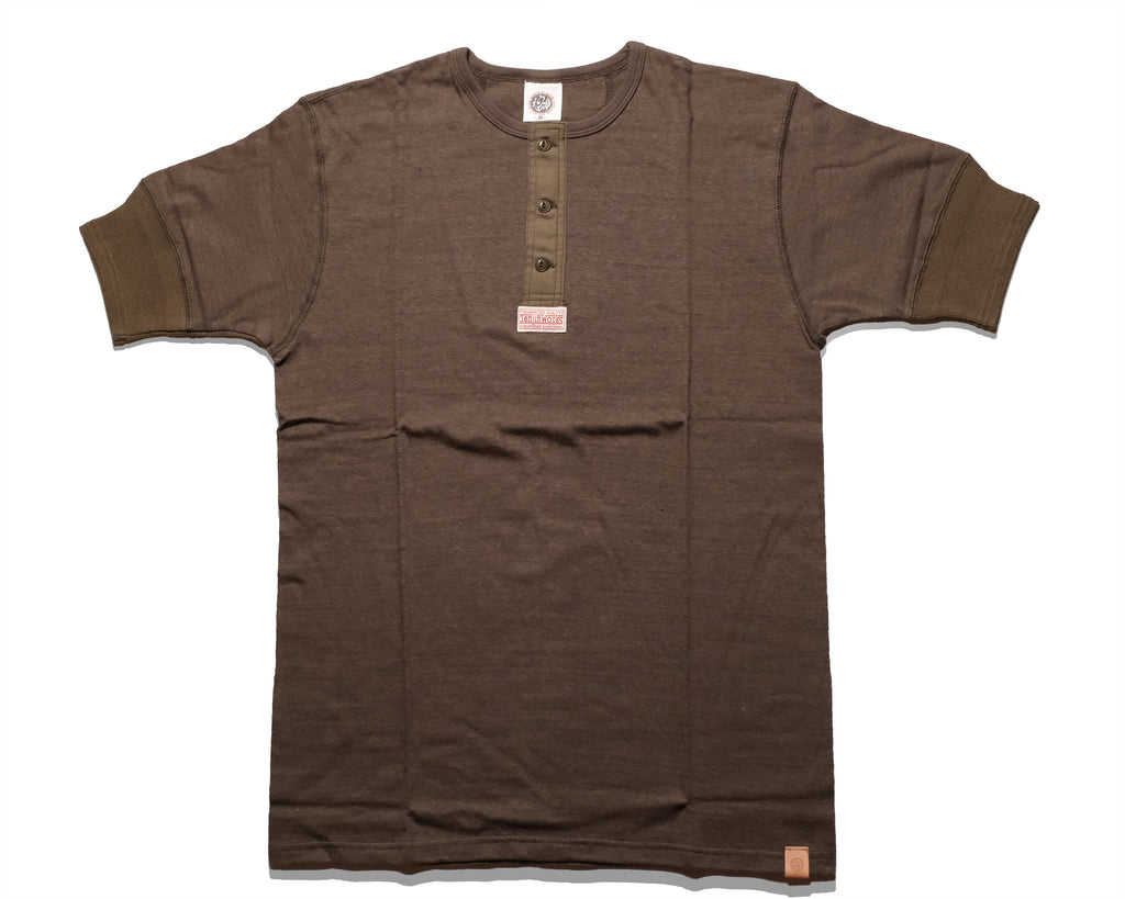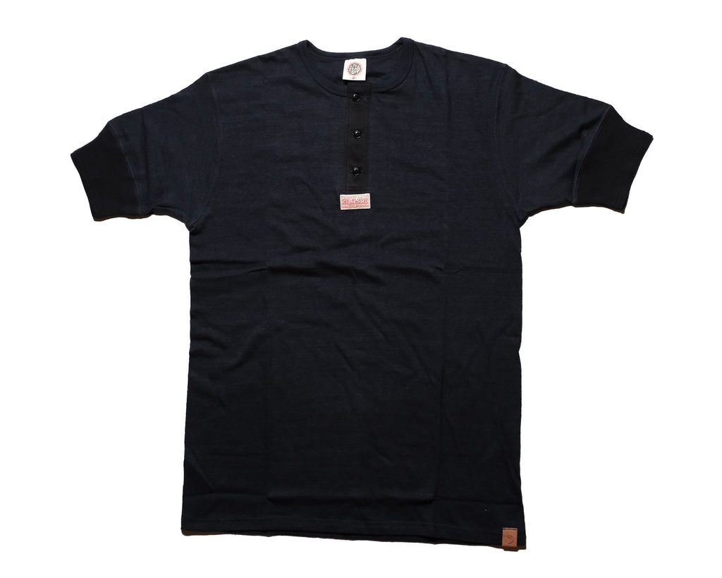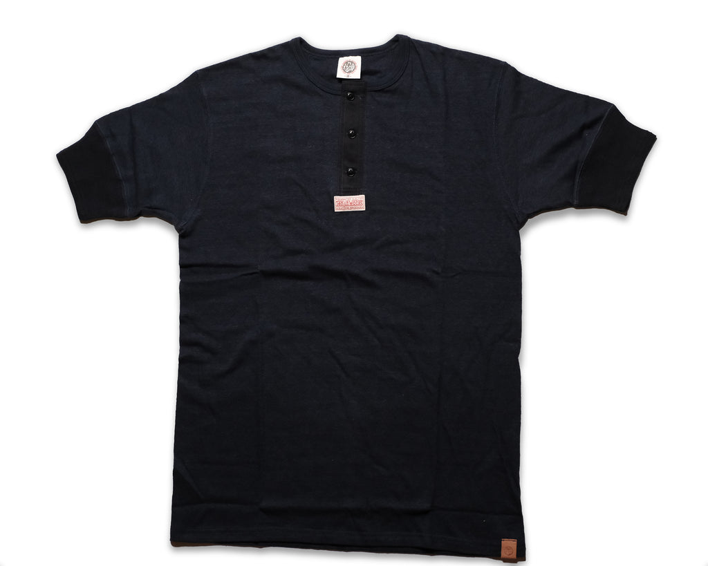 編み糸は太番手16番の単糸のオールドコットンを使用。単糸を使うことで洗い後のヴィンテージ特有の斜行感を味わえます。オールドコットンはリサイクルコットンを使ったムラ糸(1本の糸で太さに違いがある糸)で、古着の雰囲気を再現できる独特な風合いがありその表情の変化をお楽しみ頂けます。その糸をさらに希少な吊り編み機を使って編むことで柔らかくて伸縮性に富んだ丸胴の生地を製作しました。吊り生地は、着伸びしても洗い後にもとの幅に戻りやすいので、タイトフィットなヘンリーにも相性は抜群です。 縫い糸は天然素材の綿糸の50番手を使用。丈夫でステッチの表情の変化も見どころ。襟はフライス編みバインダーヘンリーネックを採用し、ボタンの天然コロゾボタンは風合いも良くこのシャツのポイントとなっております。 また、袖口リブは30年代のヴィンテージのディテールを再現。2本ラインの縫いたてリブはフィット感もさることながら、その形状自体が美しく特徴的です。 合わせて背中の当て布のデザインも30年代のディテールで汗止め&伸び防止の効果も発揮します。 数社の染工場からビーカー出しを依頼した厳選した染めは生成り(natural),黒(black), オリーブ(olive),ネイビー(navy)ともに使い込む毎に経年変化により色味の風合いが増します。 レザーブランドの誇りとして独自開発させた洗いにも耐えるタンニングレザーを裾口に付けたレザータグも経年変化が楽しみなディテールの一つ。 レザージャケット、レザーシャツのインナーとしてはもちろんのこと、アンダーウェアとしてだけでは勿体ない拘りぬいた逸品、ぜひご堪能下さい。