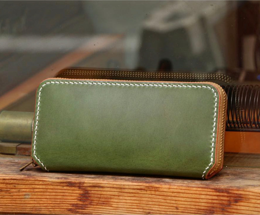 ラウンドジップをあしらったロングウォレットです。 ジッパー以外は全て革を使用し総手縫いで仕上げました。表革も1枚革を贅沢に使用し、経年変化を充分楽しんでいただけます。すべて手縫いの丈夫さに加え革の堅牢さにもこだわりました。 また、中の造作は中央のコインケースの他にカードポケットが13ヶ所独立してあり、マネーポケット(札入れ)も2箇所ございますので、収納力も抜群です。オリジナルのヘビータンニングレザーは長年使用いただくと自分だけの一点ものとなります。永年そのエイジングを楽しめる温かみのある手づくりのオリジナルシルエットのロングウォレットです。