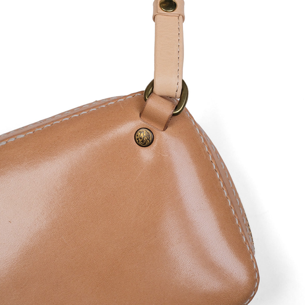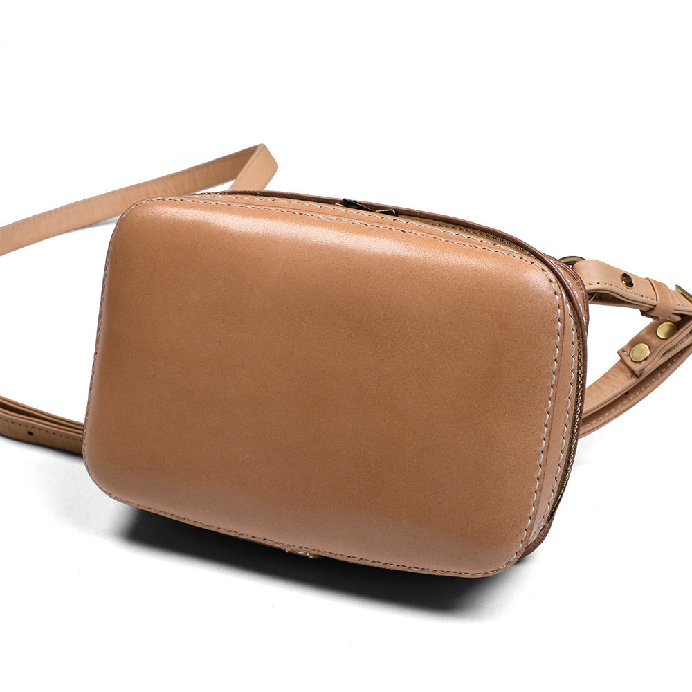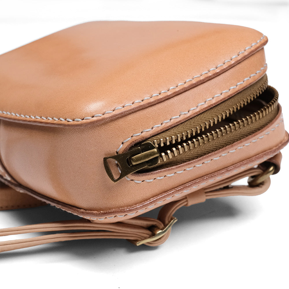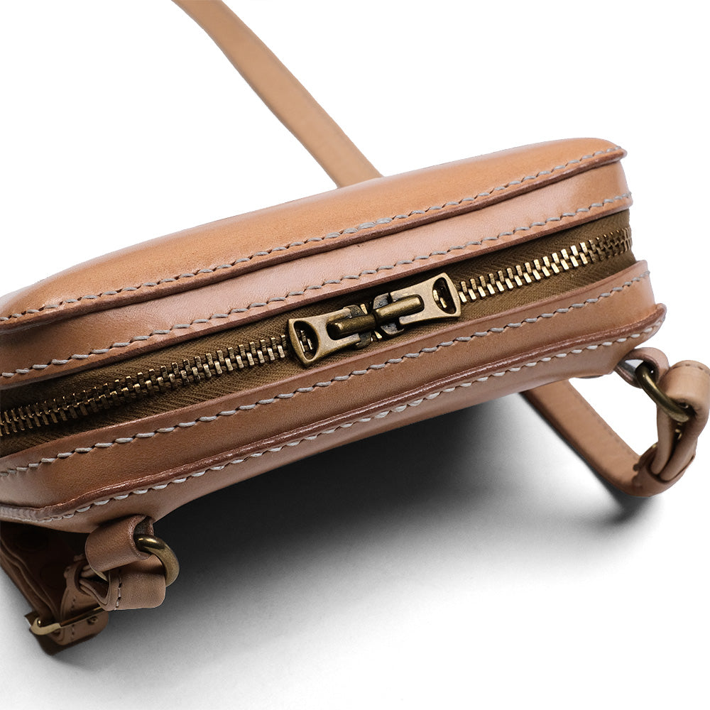 今や出かける際の必需品となったスマートフォン。スマートフォンを中心に収納して持ち運びできるスマートフォンホルダーの登場です。こちらは横型のモデルとなります。 シンプルな見た目ではあるがつくりに拘り職人技が光る縫製技術を駆使してつくりあげられた、総手縫いの作品です。 顔となる表面のラウンドした形状もこのバッグの魅力のひとつとなっております。 開閉はダブルジップ仕様で大きくサイドに口が開くので物の出し入れが容易にできます。 内側も前面にレザーを貼っておりますので、見た目も美しく収納する物を安全に保護してくれます。 ショルダーもレザー製で長さを容易に調整できますので、軽装な時期と重装な時期に長さを調整するなど、ご自身のお好きな長さでご愛用する事ができます。 レザーのエイジングも丸ごと楽しみな気軽に出かけられるスモールバッグとしてもどうぞご活用下さい。