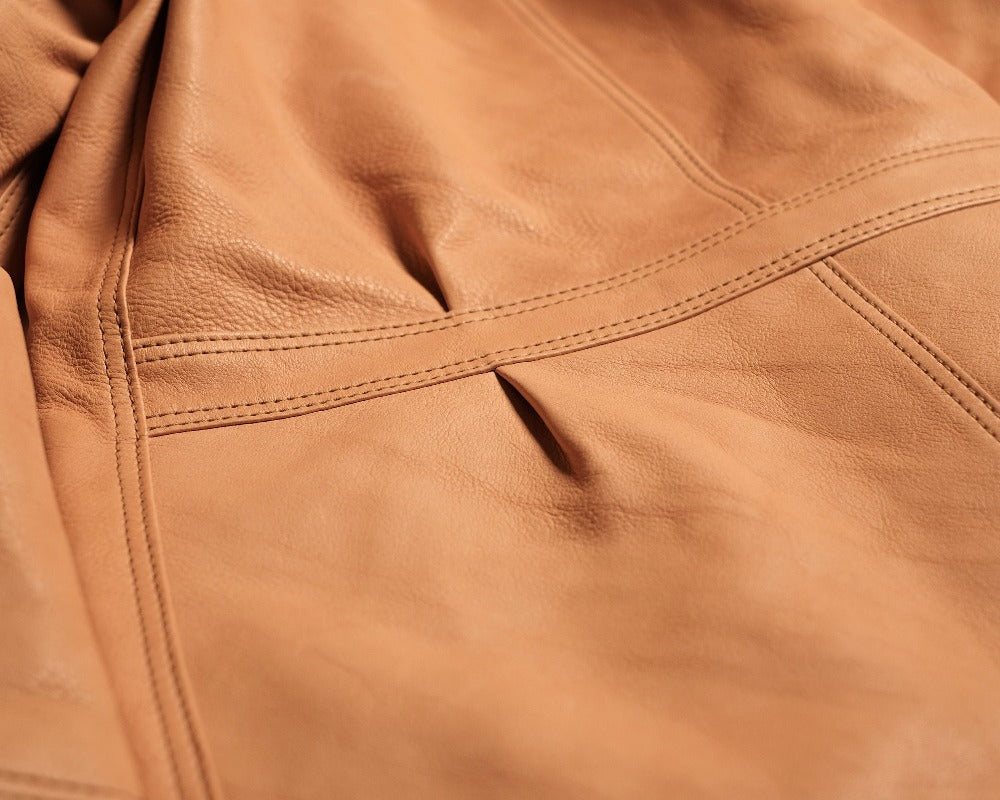 1920~30年代のヨーロッパ、アメリカのワークウェアにインスパイヤーされ、再構築させたワークジャケット。 かつての労働者のワークジャケットがレザー製であったら、、をイメージし具現化した天神ワークスの意欲作。 全体的にはカバーオールの形を持ちながら、背中ダーツでその野暮ったさを解消。そのディテールはヨーロッパからの流れを汲みます。 袖はラグラン袖を採用。高い運動性を持つことも勿論、古いカバーオールに見られるその仕様はデザイン性も美しく完成度を高めてくれてます。 肩から袖、胸から裾口へとのびるラインの美しさに拘り、幾度もパターン修正を加え完成された形はどの角度から見ても、包み込む者を魅了してくます。 レザーは国産牛(地生)を世界が誇るタンナー栃木レザーで長い時間をかけ丁寧に鞣された至極のレザーを使用。その質感、耐久性は勿論、美しいエイジングが加わり所有者に最高の所有感を満たさせてくれます。 革厚にも拘り、レザーウェアの重い、堅いを払拭すべく履き心地と耐久性を追求した極みの厚み(0.9t)を採用。クラフツマンの実用性も考慮させ、着心地の良さから様々なスタイルにマッチすることでしょう。 また、フロントを含め随所にポケットを配置した贅沢なつくり。この拘りの追及もクラフツマンパンツを名乗る以上の誇りでもあります。 そのこの先、数年後を妄想させてくれるその質感に気持ちが高まり、毎日袖を通す喜びを味わえます。 フロントに採用した天神オリジナルの20㎜のブラスボタンはそのデザインと質感がマッチしてジャケットの魅力を増してくれてます。袖口にもオリジナルのタックボタン。台襟から伸びるチンストラップ、ドーナツボタンも量産品にはない拘りでウィンテージ感溢れております。 胸のポケットは使いやすい形状でその優美なアールとステッチワークがシンプルなデザインの中で映えます。さらに内蔵された隠しウォッチポケットに男のロマンを詰め込めます。 もう片方のポケットはCP01ワークパンツに共通のデザインでシリーズとして楽しめます。ステッチワークはどの箇所を見ても美しく、各所熟練の職人だけがしか縫い上げる事の出来ない仕様。襟裏の補強ギザギザステッチへの拘りも圧巻です。この縫製の美しさだけでもこのレザーウェアは所有する価値があります。 ライニングは天然素材のフランネルコットンを採用。レザーと共にその風合いを楽しめます。 使い込んで有機的な皺、色味が加わってこのレザージャケットは真の姿を見せてくれるでしょう。ぜひその生きた証人となって頂きたい、そんな魅力を秘めた1着です。