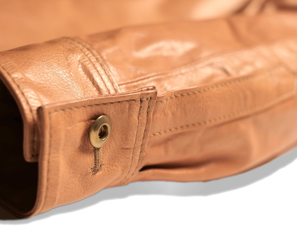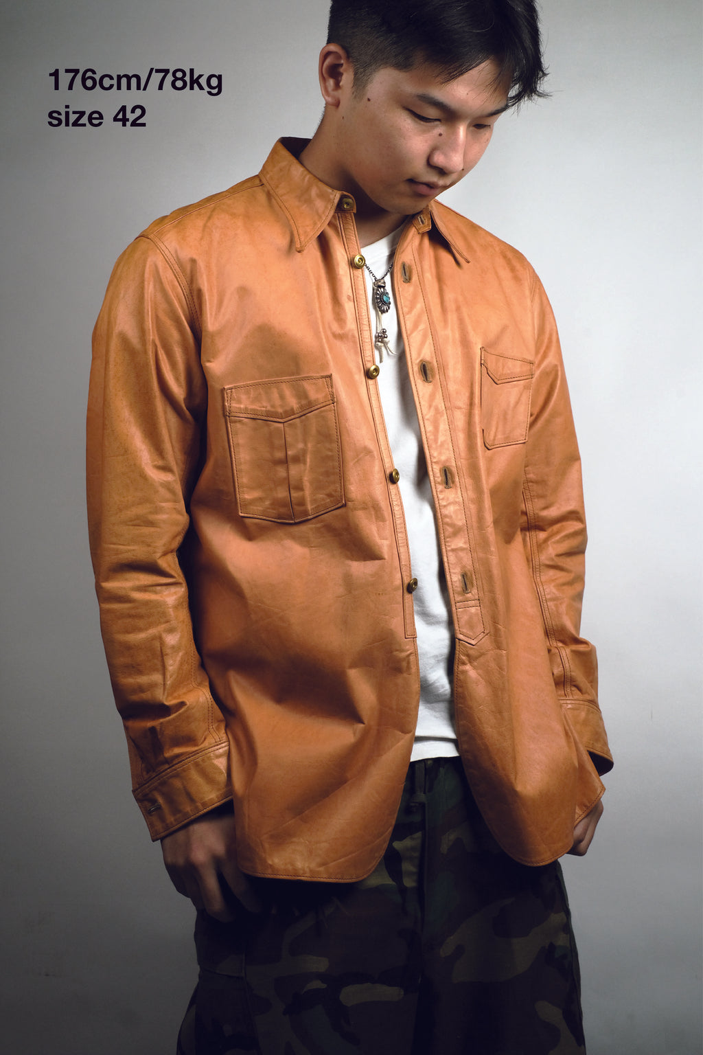 1920~1930sのワークシャツをデザインソースに、キップレザーというきめ細やかな仔牛の革をマテリアルに、ソフトでしなやかな牛革のシャツが生まれました。キップレザーは生後6ヶ月〜2年くらいまでの中牛革。キメが細やかなその銀面は美しく、堅牢性も備えた希少な上質なレザーです。 牛革を使用したシャツはシャツというよりその堅牢性からシャツジャケットになりがちですが、よりしなやかなキップレザーをさらに0.6mmに薄く漉くことにより、牛革での”シャツ”らしさを実現させました。 革の表層の銀面が薄いキップレザーだからこそ実現できた革厚と確かな縫製で他に類をみないレザーシャツをカタチにできました。 ディテールは20〜30sに実在したワークシャツをモディファイし、チンストラップ、ロングポイント、マチ等各部位にも拘り、そのクラシック感が素材の馴染みとマッチし、ネオヴィンテージ生み出してくれます。 パターンは有機的なカッティングラインを多く取り入れることにより、着用した際のフィッテングとそのつくり出すラインの美しさは手にした所有者を虜とするでしょう。 ライニングは強くしなやかなコットンサテンを採用。 ボタンは真鍮製のオールド感漂うクラシックボタンを採用。レザーと同様にそのエイジングも楽しみな部位となっております。 天神ワークスが生み出した至極のレザーシャツ。シャツとしてレイヤードも楽しめる3シーズン使えるレザーウェアです。